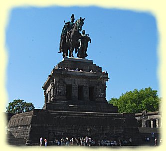 Wir verlassen die BUGA und gehen auf das Deutsche Eck, einer künstlich aufgeschütteten Landzunge, an der Mündung der Mosel in den Rhein. Im Jahr 1897 wurde hier ein monumentales Reiterstandbild des Deutschen Kaisers Wilhelm I. errichtet. Es ist das Wahrzeichen der Stadt Koblenz und auch schon vor der BUGA ein bedeutender Anziehungspunkt für Touristen.