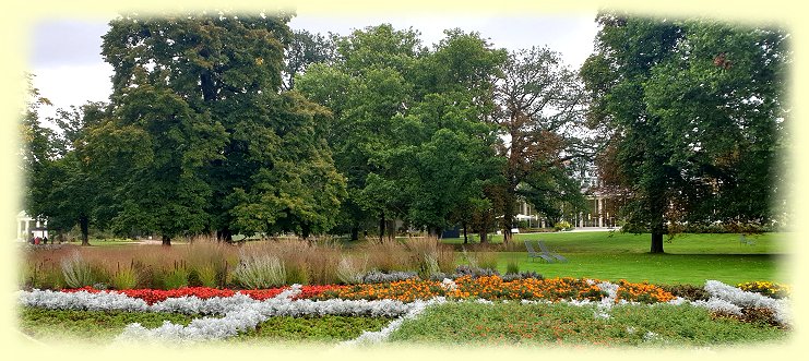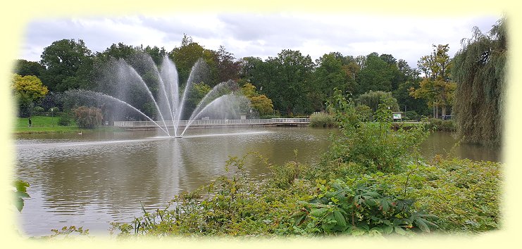 Am Kurpark schließt sich ein Landschaftsgarten an, dem wir zum Abschluss noch einen Besuch abstatten. Bereits von Weitem sichtbar ist die riesige Wasserfontäne, die aus der Mitte des Kurparksees emporschießt. Die Salze, die uns bei unserem Altstadtbummel schon begleitet hat, speist auch den See und fließt weiter durch den Landschaftsgarten. Er wurde 1908 zusammen mit dem großen Parksee angelegt und seitdem ständig erweitert.