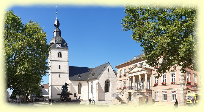 Nun fahren wir zum sehenswerten Marktplatz, mitten im historischen Ortskern, mit Erlöserkirche, Donopbrunnen und Rathaus. Die evangelische-reformierte Erlöserkirche ist neben dem Schlossturm das einzige nahezu unverändert erhaltene mittelalterliche Gebäude, das den Stadtbrand von 1547 überstanden hat. Die große Glocke die 1568 gegossen wurde, auch Feuerglocke genannt, konnte sowohl im Ersten als auch im Zweiten Weltkrieg gerettet werden. Sie ist die älteste Glocke der Stadt.