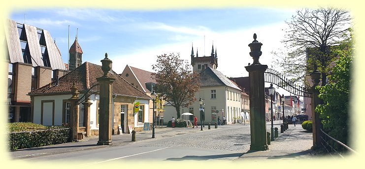 Wir gehen nur wenige Meter weiter und stehen vor dem Münstertor. Es ist ein schön gestalteter Stadteingang, der uns vermittelt, dass man in eine historische Altstadt kommt. Das Tor wird durch historische Torschreiberhäuser (von wo aus der Verkehr sowie die Ein- und Ausfuhr von Gütern kontrolliert werden konnte) und barocke Torpfeiler der ehemaligen Zisterzienserabtei Marienfeld geziert.