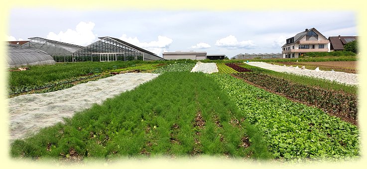 Die Reichenau ist auch als Gemüseinsel bekannt und so liegen viele Gemüsefelder und Gewächshäuser an unserem weiteren Radweg. In den letzten Jahrzehnten wurden große Anstrengungen zur Weiterentwicklung des Gemüsebaus unternommen. Es gibt ein Beregnungsnetz für die Felder und der Ausbau der Gewächshausflächen wurde vorangetrieben. Alle diese Maßnahmen ermöglichen heute trotz der verhältnismäßig kleinen Anbaufläche eine jährliche Produktion von rund 14.000 Tonnen Frischgemüse.
