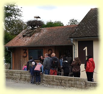 Trotzdem lassen wir unsere Blicke über die Dächer der umliegenden Gebäude schweifen, denn hier lebt die größte, freifliegende Storchenkolonie Süddeutschlands. Rund 50 Storchenpaare brüten auf den umliegenden Dächern. Welch eine Idylle. Die Jungtiere machen erste Schlagbewegungen mit den Flügeln und gieren nach Nahrung, wenn ein Elterntier angeflogen kommt. Ein ausgewachsener Weißstorch ist über einen Meter groß, hat eine Flügelspannweite von ca. zwei Metern und ist mit seinem weiß-schwarzem Gefieder und dem roten, langen Schnabel unverwechselbar.