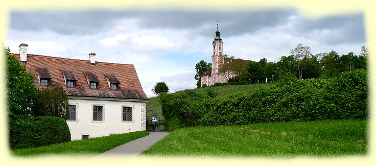 Nach einem kurzen Halt radeln wir weiter an wunderschönen Uferlandschaften vorbei, bis wir über den Weinbergen des Überlinger Sees die prächtige Marienwallfahrtskirche Birnau liegen sehen. Das barocke Gesamtgebilde in rosa und weiß, bestehend aus zwei Priesterhäusern und dem hohen Turm der Basilika thront hoch über dem Bodensee und ist durch ihre hervorragende Lage weithin sichtbar.