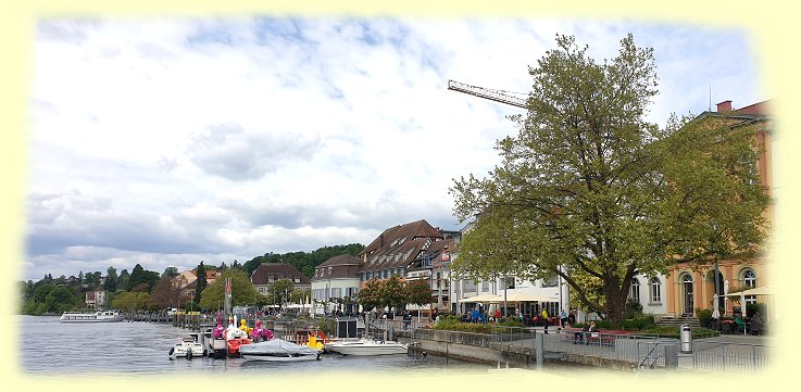 Wir schieben unsere Räder entlang der Seepromenade, die von vielen Cafés und Restaurants gesäumt wird, bis zum Landungsplatz. Er ist heute der meistfrequentierte Ort in der Stadt. Der Platz wurde im 19. Jahrhundert als „Empfangsraum“ für die mit dem Schiff ankommenden Gäste errichtet. Hier legen zahlreiche Schiffe zu Rund- und Ausflugsfahrten ab. Neben der „Weißen Flotte“ der Bodensee-Schifffahrtsbetriebe bieten in Überlingen vier weiter private Anbieter neben Linienfahrten auf dem Überlinger See auch Rundfahrten sowie kulinarische Themenfahrten an.