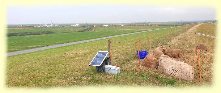 Nur 500 Meter vom Zollhaus entfernt stand eine große Schautafel mit dem Titel: „Neugierig, was vor unserem Deich passiert?“ Sicherlich – darum treten wir auch in die Pedale und radeln hinauf auf den Deich. Oben angekommen treffen wir auf eine Gruppe Schafe, die zur Nordsee einfach dazugehören. Doch haben die ihren wichtigen Job heute wohl noch nicht angetreten und kuschelten sich noch gemeinsam zusammen.