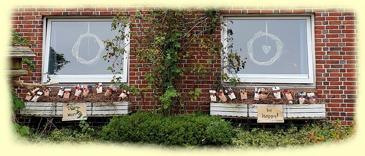 Es ist Cuxhavens Heidedorf am Meer und zeigt sich von seiner beschaulichen und glücklichen Seite. Auf der Homepage heißt es: Zum Entspannen und Ruhe tanken sind sie bei uns in den besten Händen und so ist es nicht verwunderlich, dass wir an einem Haus vorbeiradeln, an deren Fensterfront zwei Blumenkästen mit lächelnden Gesichtern geschmückt sind und „Don`t worry - be happy“ (mach dir keine Sorgen, sei glücklich) davor stand.