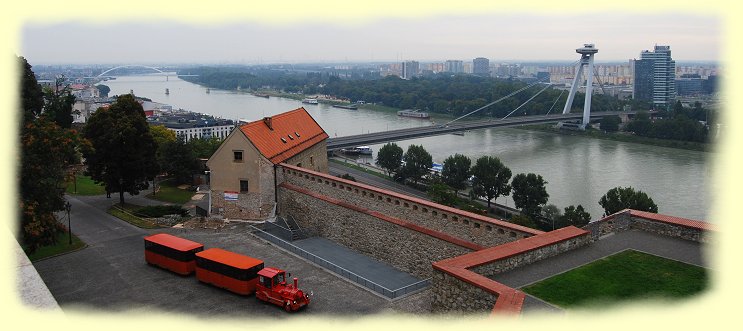 Von der Burgterrasse bietet sich eine hervorragende Aussicht in Richtung Süden über die Donau zum Stadtbezirk Petrzalka, auf der anderen Seite der "Neuen Brücke" mit dem UFO-Restaurant.