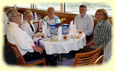 Pünktlich zum Ablegen sind wir wieder zurück an Bord. Ein letzter Blick auf die malerische Umgebung und hinauf zur Burg dann geht es zum Mittagessen.