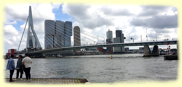 Die Erasmusbrücke, eine 802 Meter lange Schrägseilbrücke spannt sich majestätisch über die Neue Maas, einem Hauptstrom im Rhein-Maas-Delta. Die Brücke ist seit ihrer Eröffnung 1996 eins der neuen Wahrzeichen Rotterdams. Sie ist auf dieser Wasserstraße die letzte Brücke über den Rhein, bevor dieser in die Nordsee endet. Ferner verbindet sie das Stadtzentrum mit dem Wilhelminapier, welches seit der Jahrhundertwende von Hochhäusern und modernen Anlagen geprägt ist.