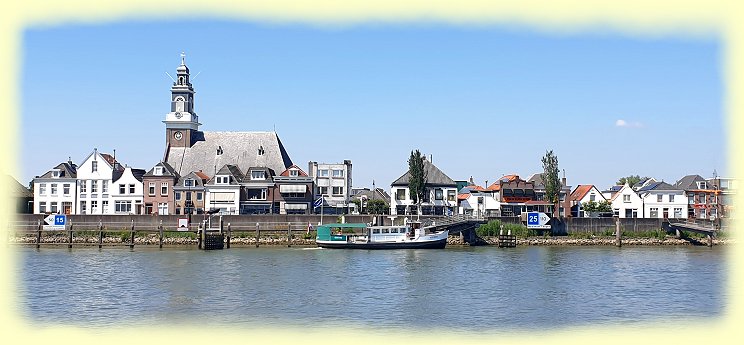 Bei herrlichem Sonnenschein sitzen wir bequem in den mit dicken Kissen ausgestatteten Korbmöbeln, über uns ein riesiger schattenspendender Sonnenschirm und genießen die vorbeiziehende Landschaft so auch der Ort Lekkerkerk. Es ist ein langgestrecktes Deichdorf und stark zum Fluss hin orientiert. Rund um die Grote- oder Johanneskerk hat sich jedoch ein Dorfkern gebildet. Die vom Wasser gut zu erkennende Kirche wurde 1575 erbaut und hat einen eingebauten Westturm. 1972 wurden die Kirche und der Turm wegen ihrer bau- und kulturgeschichtlichen Bedeutung zum Nationaldenkmal ernannt.