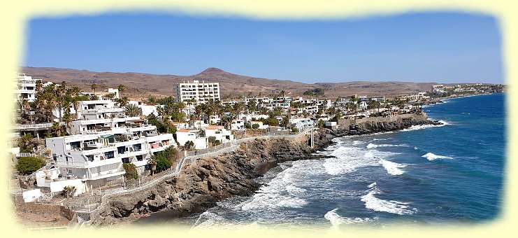 Was liegt neben San Agustin, gleich hinter dem Felsrücken, fragten wir uns vor 12 Jahren, wenn wir am Strand spazieren gingen. Leider ist bis heute die Promenade wegen Steinschlag unterhalb des Felsrückens noch immer gesperrt und so klettern wir wieder einmal den ganzen Hang über unzählige Treppenstufen hinauf. Das Klettern fällt uns heute doch schon bedeutend schwerer und so bleiben wir des Öfteren stehen und genießen den Blick von der Anhöhe.