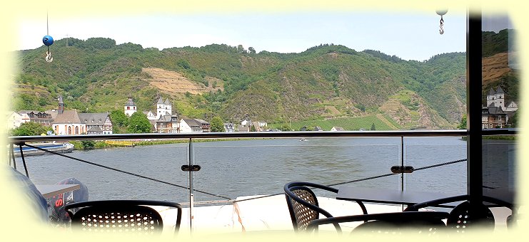 Von Tisch 10 am Heck konnten wir bei komplett geöffneter Glasfront während des Essens die schöne Flusspassage in Richtung Treis-Karden genießen sowie die Schleusenfahrt in der Schleuse Müden bei km 37,1.