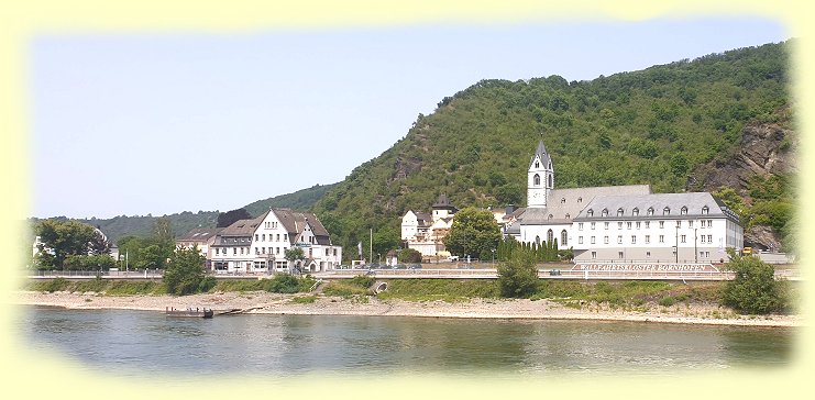 Wie ein Film laufen die Sehenswürdigkeiten an uns vorbei. So fahren wir einige Zeit später am Doppelort Kamp-Bornhofen vorbei. Hier steht unterhalb des steilen Schieferfelsens das Kloster Bornhofen. Es ist ein Franziskanerkloster mit Marien-Wallfahrtskirche.
