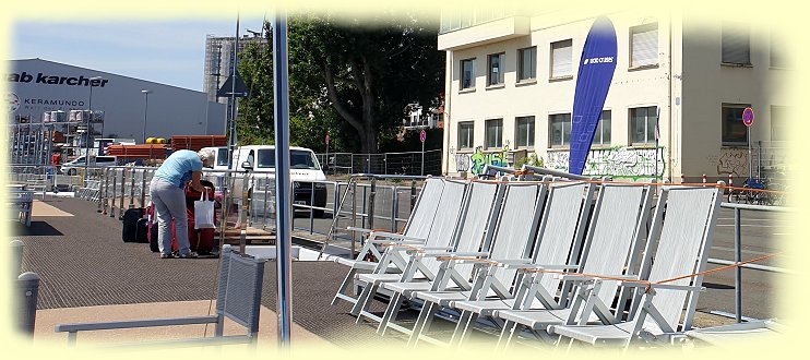 Trotz dieses Logenplatzes zog es uns jedoch wieder hinauf aufs Außendeck, denn dies ist der beste Platz um sich heute bereits auf morgen zu freuen. Bei angenehmen Temperaturen fährt das Schiff in Richtung Main-Mündung.