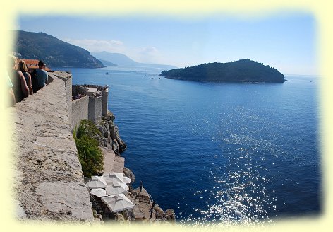 Wir gehen jedoch erst einmal weiter auf dem Befestigungsring, der hier oberhalb des Meeres entlang führt, und genießen den Blick auf das türkisblaue Meer mit dem grünen Fleckchen der Insel Lokrum.