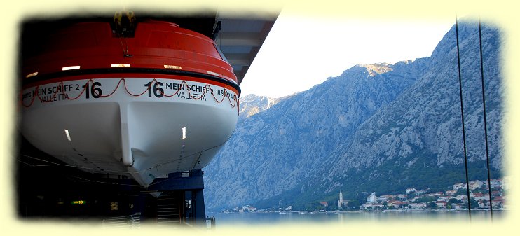 Für uns hieß es heute Tendern, mit den Rettungsbooten der MS 2. Von unserer Veranda beobachten wir noch wie die Tenderboote zu Wasser gelassen werden und dann müssen wir zu unserem Treffpunkt, um unsere Tenderkarten abzuholen. Bis wir aufgerufen werden, genießen wir noch den Blick auf den mächtigen Gebirgszug, der die Bucht umrahmt. Da unser Schiff sehr weit draußen liegt, dauert die Tenderfahrt ca. 20 Minuten. Doch bei reizvollen Blicken auf die malerische Bucht von Kotor vergeht die Zeit viel zu schnell. Unser Ausflugsbus, mit dem wir die Perlen der "Adriatischen Küste" erkunden wollten, wartete schon auf uns. Unsere Fahrt führte uns entlang der schönen Adriaküste von Kotor etwas weiter südlich nach Budva.