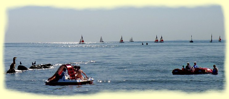 Wir genießen die Tage bei wolkenlosem Himmel, einer leichten Brise, geschützt sitzend im gemütlichen Strandkorb und die Zehen im Sand vergraben. Zur Abwechslung laufen wir barfuß an der Wasserkante entlang, haben Gelegenheit, unseren Blick über das Meer zu schicken, das am Horizont mit dem blauen Himmel zusammenstieß, während unsere Füße von der Ostsee umspült werden, denn am Strand der Ostsee ist immer Wasser. Es treten keine deutlichen Gezeiten auf. Der Tidehub beträgt lediglich etwa 15 cm.
