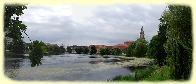 Am Ufer des Kleinen Kiel führt uns der Stadtbummel weiter. Es ist ein seichtes Binnengewässer, das durch eine Brücke in zwei Teile zergliedert ist und eine Verbindung zur Kieler Förde hat. Er umrahmt den Kieler Altstadtkern und ist zusammen mit dem Kieler Rathaus auf fast jedem Bild zu sehen.