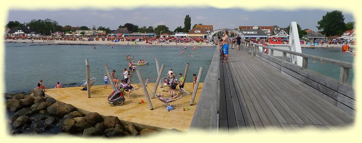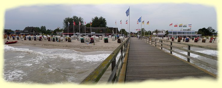 Am Seebrückenvorplatz mit der 305 m langen Erlebnis-Seebrücke stellen wir noch einmal unsere Räder ab und bummeln auch hier entlang der neuen, schön angelegten 1,5 km langen Promenade, die sich verspielt am Strand entlang schlängelt.