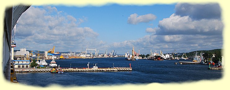 Heute trafen wir uns gemeinsam beim Frühstück an unserem runden Tisch im Markt Restaurant. Von hier beobachten wir das Anlegemannöver. Durch eine 180 Grad Drehung bekamen wir gleich einen Teil des Industrie- und Marinehafen von Gynia zu sehen, von dem wir kurze Zeit später zu einer geführten Stadtbesichtigung in die 30 km entfernte Altstadt von Danzig aufbrachen.