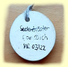 Kurz bevor wir den Ort wieder erreichen treffen wir noch auf einen „Seelentröster“. Eine bunt bemalte Baumscheibe hing an einem Rebenzweig mit dem Vermerk „ein Seelentröster für dich, MR 03/22“.