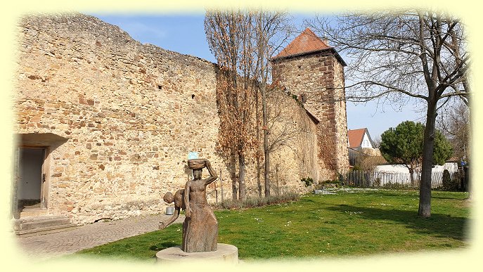 Wir gehen entlang der etwa 1,3 km langen Mauer aus rotem Sandstein. Vorbei an kleinen Bauerngärtchen und schön gestalteten Grünflächen, mit verschiedenen Skulpturen, die den äußeren Stadtmauerrundgang aufwerten. Die nahezu lebensgroße Skulptur mit dem Titel “die Waschfrauen“ erinnert an den ehemals in der Nähe gelegenen Waschplatz des Ortes.