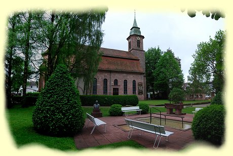 Am anderen Ufer steht die ev. Markus-Kirche. Auch diese Kirche musste nach dem Krieg wieder aufgebaut werden und erhielt neben den beiden Seitenschiffen nur noch einen kurzen, gedrungenen Turm. Strahlende Sonne am blauen Himmel hatte sich heute Morgen zwar noch nicht eingestellt, doch lockerte der Himmel auf, so dass wir unsere Rundfahrt fortsetzen konnten und zum Mittagessen in Bad Herrenalb eintrafen.