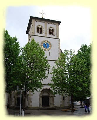 Wir haben unser Auto in einem Kaufhaus-Parkhaus abgestellt, gehen durch die Fußgängerzone und gelangen zur katholischen Kirche St. Josef. Sie wurde 1901 erbaut und bei einem Fliegerangriff 1944 fast vollständig zerstört. Erst 1950 konnte der Wiederaufbau abgeschlossen werden. Der Baustil ist der frühromanischen Architektur nachempfunden.