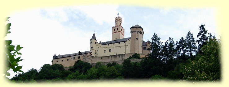 Wir schlafen jedoch wieder ein und werden um 7.00 Uhr durch das Anlegemanöver erneut geweckt und unser erster Blick aus dem Kabinenfenster zeigt uns die Marksburg hoch über dem Rhein.
