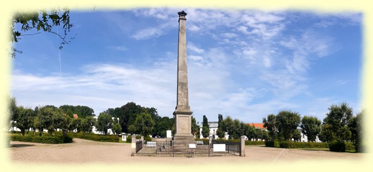 Durch die Rasen-Innenfläche führen acht sternförmig verlaufende Wege, in deren Schnittpunkt ein Obelisk an die 1810 erfolgte Ortsgründung und Fürst Wilhelm Malte I. erinnert, dem fast alles hier in Putbus zu verdanken ist.