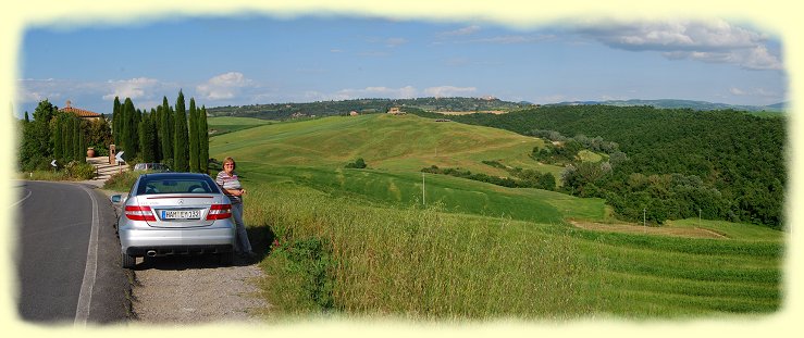 Nach solch einem schönen Vormittag in dieser kleinen Stadt setzen wir unsere Fahrt fort, um das meist fotografierte Haus der Toskana zu finden, welches laut unseren Unterlagen nur einige Kilometer hinter Pienza auf der Straße nach San Quirico stehen soll. Auf dieser Straße begann eine wunderschöne Fototour. Immer wieder stoppten wir für traumhafte Bilder der wellenartigen Hügellandschaft. Fotografieren einzelne oder in Grüppchen stehende Zypressen.
