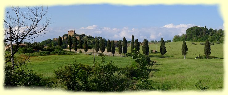 Erhaben auf einer kleinen Anhöhe, umgeben von Zypressen steht dieses so beliebte Postkartenmotiv. Dieses Bild findet man in fast jedem Bericht über die Toskana, in den Katalogen der Reiseveranstalter und in jedem Reiseführer. Warum gerade dieses Haus, das weiß keiner so genau, denn in der Toskana gibt es unzählige romantisch gelegene Gebäude in einer traumhaften Landschaft.