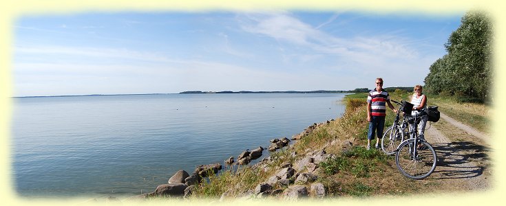 Von diesem kleinen Ort führt direkt über dem Deich ein Schotter-Radweg bis nach Pudagla, den wir für unsere Rückfahrt nutzen wollen. Dieser Deich am Achterwasser ist angelegt worden, um das Hinterland gegen Hochwasser zu schützen. Es ist ein wunderschöner Radweg an dem sich Schilfgürtel und freie Sicht auf das Achterwasser abwechseln. Immer wieder steigen wir vom Rad und genießen diese Idylle, die gleichzeitig auch immer wieder schöne Fotomotive bietet.