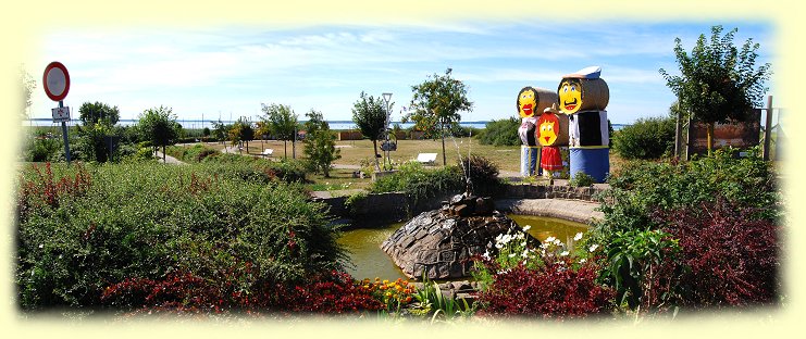Bei unserer Weiterfahrt treffen wir auf „Kunst durch Bauernhand am Straßenrand“. An einem liebevoll gestalteten Teich mit Springbrunnen treffen wir auf drei Strohpuppen. Sie sollen sicherlich auf einen besonderen Anlass in der Umgebung hinweisen. Uns erinnern sie daran, dass der Herbst gekommen ist. Diese Strohfamilie ist auf jeden Fall ein Foto wert.
