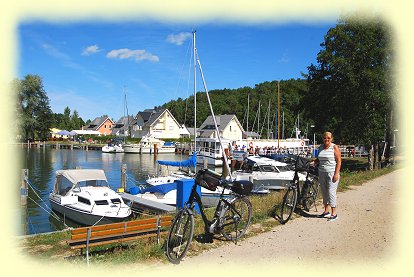 Wir bleiben jedoch lieber bei unseren Fahrrädern und rollen damit kurze Zeit später in den Hafen von Ückeritz. Der Ort ist bekannt für seine Zeltplätze am schönen Ostseestrand, aber hier, etwas weiter westlich davon, geht es bedeutend ruhiger zu, denn hier liegt der historische Ortskern am Achterwasser mit seinem kleinen Sportboothafen.