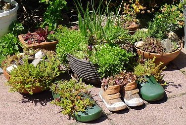 Mit Sukkulenten bepflanzte Schalen und Kaffeekannen